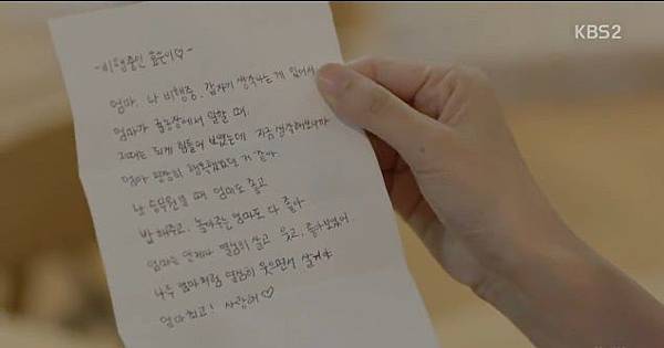 十七、機場同事把之前孝恩去紐西蘭時,在飛機上寫給媽媽的信交給秀雅,孝恩說媽媽任何時候都努力的生活著,她也會像媽媽一樣努力笑著生活。